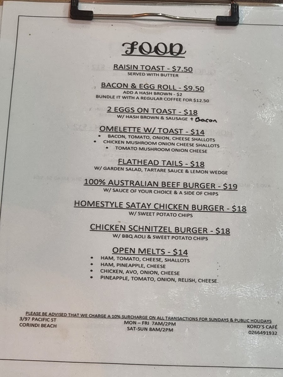Welcome to KOKO'S CAFE CORINDI BEACH, a charming cafe nestled in the heart of Corindi Beach, NSW. Here, you can indulge in a delightful menu that caters to a variety of tastes, from hearty breakfasts to sweet treats.